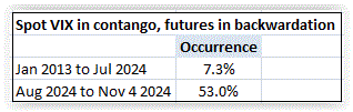 From January 2013 to November 2024, the S&P 500 index was up 54.9% of the time, while VX futures were in contango most of the time (85.2%).