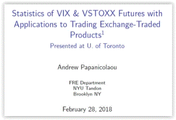This webinar by Prof Andrew Papanicolaou covers fundamental concepts of VX futures, such as contango, backwardation, and roll yield. It also presents an approach to modeling the VX futures term structure.